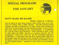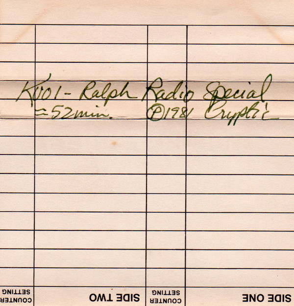 By the early '80s, Ralph Records had developed a strong following in several college campuses, one of them being the University of Idaho. So in January of 1981, radio station KUOI-FM, which is owned by the University, capitalized on this craze by making a radio special titled "Don't Make Me Ralph!".